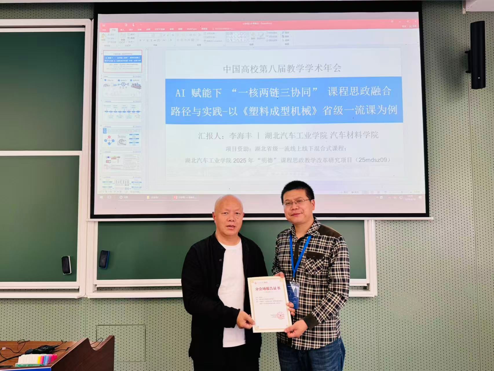 此次参会是我院推动教学改革创新、促进教师专业成长的重要体现。近年来,汽车材料学院持续推动AI技术与课程教学的深度融合,涌现出一批省级一流课程和思政示范课程。李海丰老师长期投身教学改革,曾获湖北省高校教师教学创新大赛三等奖。学院将继续鼓励教师参与高水平学术交流,深入推进AI赋能教育教学,持续提升人才培养质量,为学校建设高水平应用型大学贡献智慧和力量。