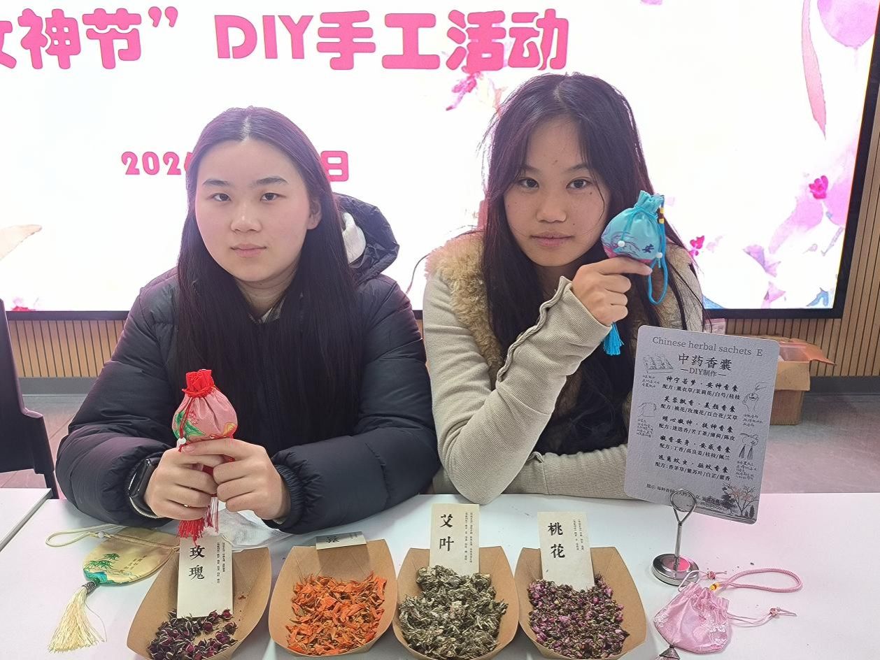 女生们专注剪裁布料、搭配药材、穿针引线,将对老师的敬意与美好期许密密缝入香囊。从药材辨识到针线缝制,沉浸式体验让同学们在感受传统手工艺魅力的同时,深刻体会到“工匠精神”的内涵,实现了美育与劳动教育的有机统一。 随后,女生代表们化身“春日信使”,带着满载心意的香袋走进办公室、教室,向女教师们献上真挚祝福。“老师,您就像白芷般清雅高洁,感谢您的悉心教诲!”一句句真诚问候,让老师们收获了意外的感动。女教师们纷纷表示,这份蕴含传统文化温度的礼物格外珍贵,既感受到了师生情谊,更坚定了教书育人的责任担当。