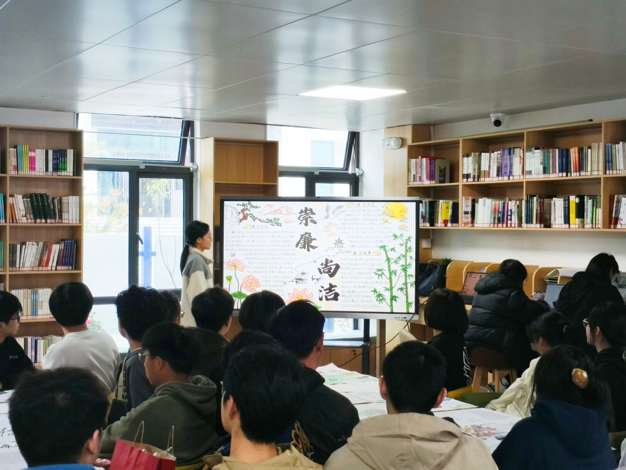 活动现场,学院学子围坐在一起,聆听同学对廉洁文化的讲解,大屏幕上的“崇廉尚洁”主题板报图文并茂,将廉洁典故、竹莲等廉洁意象与文字阐释相结合,生动展现了廉洁文化的内涵。同学们在交流互动中感悟廉洁精神,纷纷表示要将廉洁理念融入日常学习与生活,争做廉洁风尚的践行者与传播者。