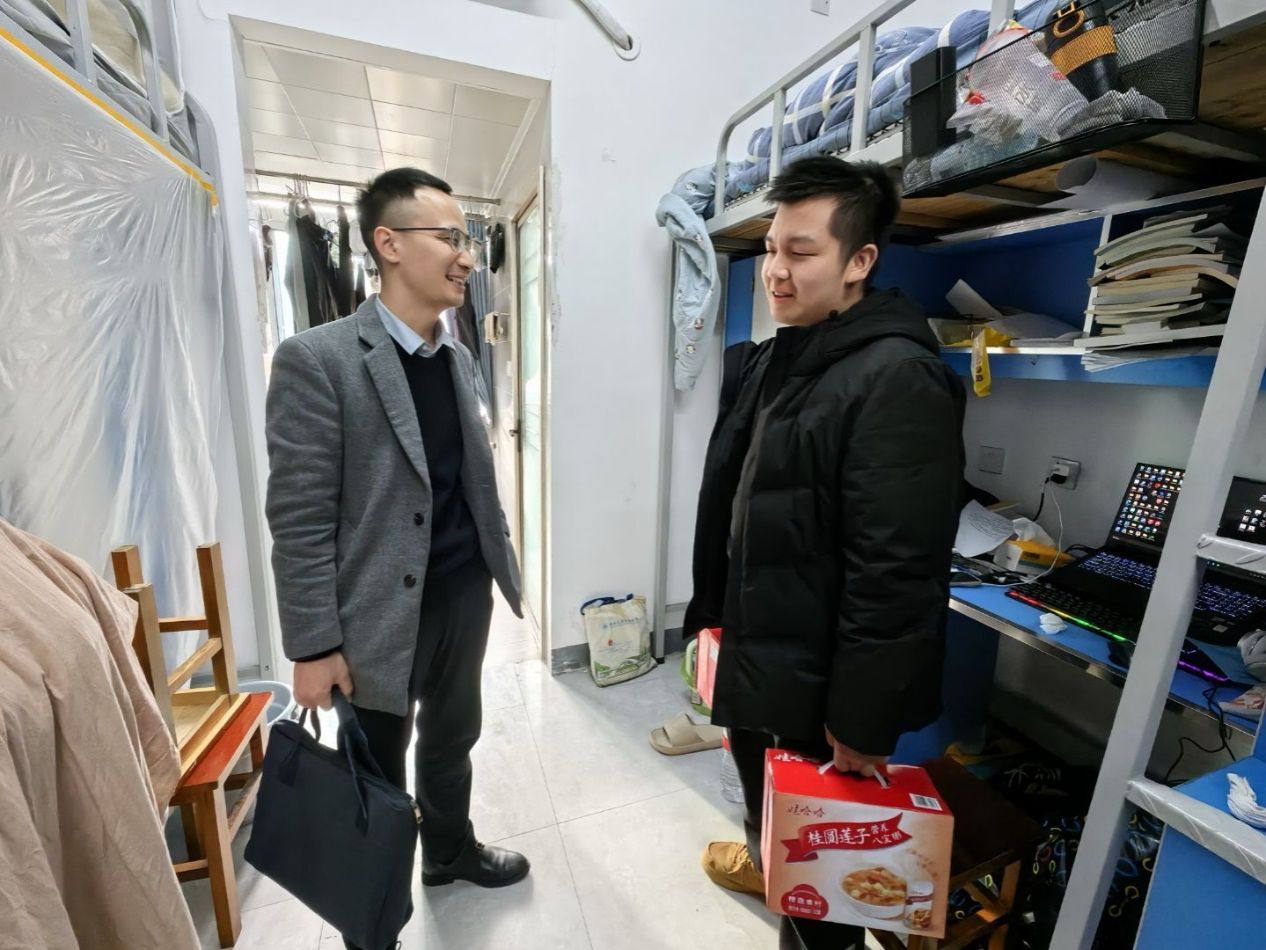 走访过程中,各位领导老师与结对同学们亲切交谈,详细询问大家的返校适应情况、新学期学习规划、生活需求以及宿舍氛围等,耐心倾听同学们的心声与建议。老师们仔细查看宿舍环境卫生、安全设施及生活条件,叮嘱同学们合理规划作息、注重身心健康、遵守宿舍管理规定,在新的学期以饱满的精神状态投入到学习生活中。最后领导老师为结对学生送上节日祝福及暖心礼品。